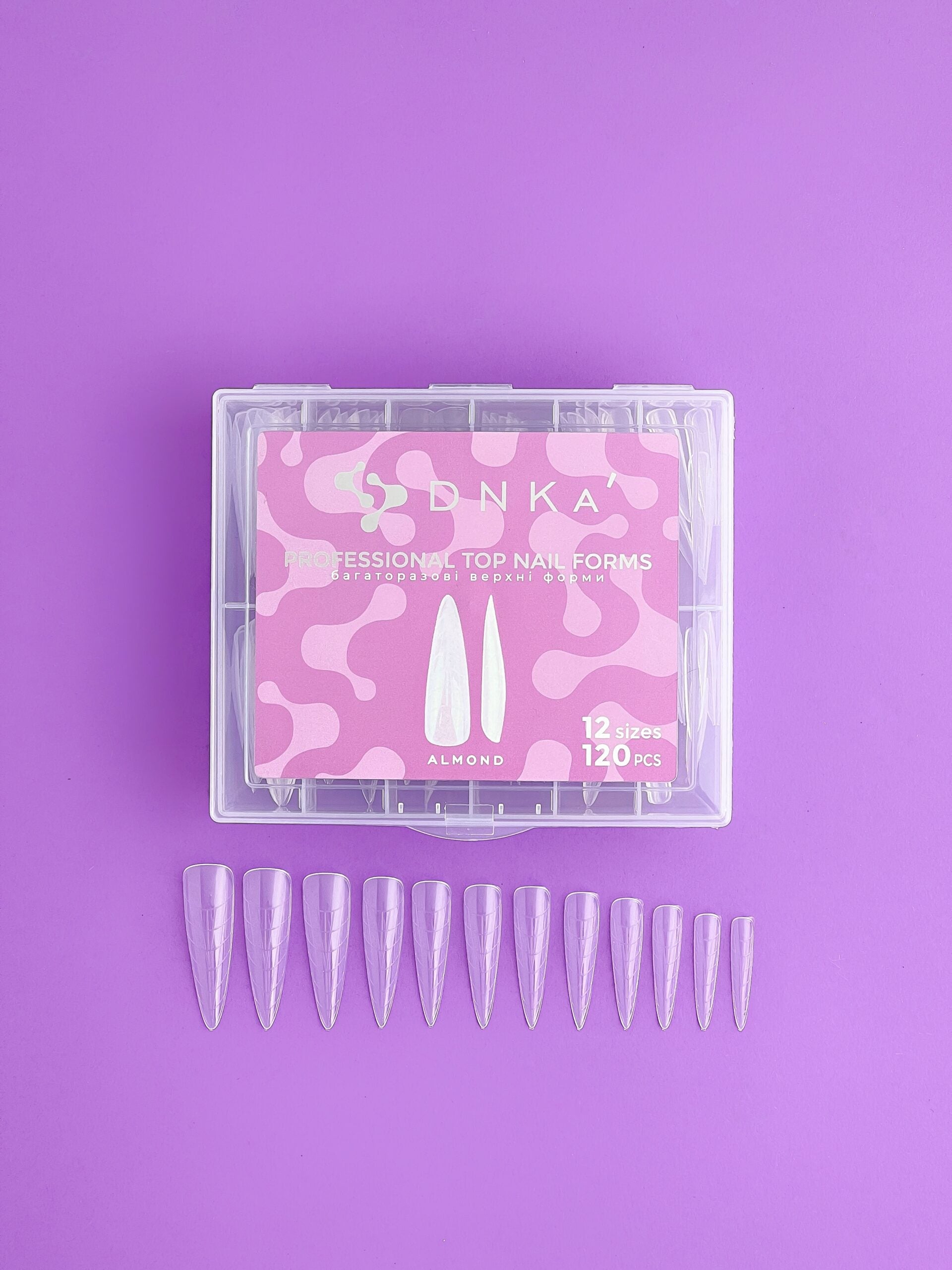 Upper reusable forms for modeling nails are a practical and quick way to save time when working, as they allow you to avoid final sawing during extension, re-extension and restoration. They have a universal shape – ballerina and are suitable for almond, oval and short square extensions. DNKa’ Professional Top Nail Forms are easily removed after polymerization thanks to the hard yet flexible plastic. Ideal for use with DNKa’ Acryl Gel, DNKa’ Builder Gel and DNKa’ Jelly Gel. Very easy and convenient to use even for beginners. The set contains 120 pieces, including 12 sizes of 10 pieces, which allows you to conveniently choose the necessary shape for any type of nail plate.