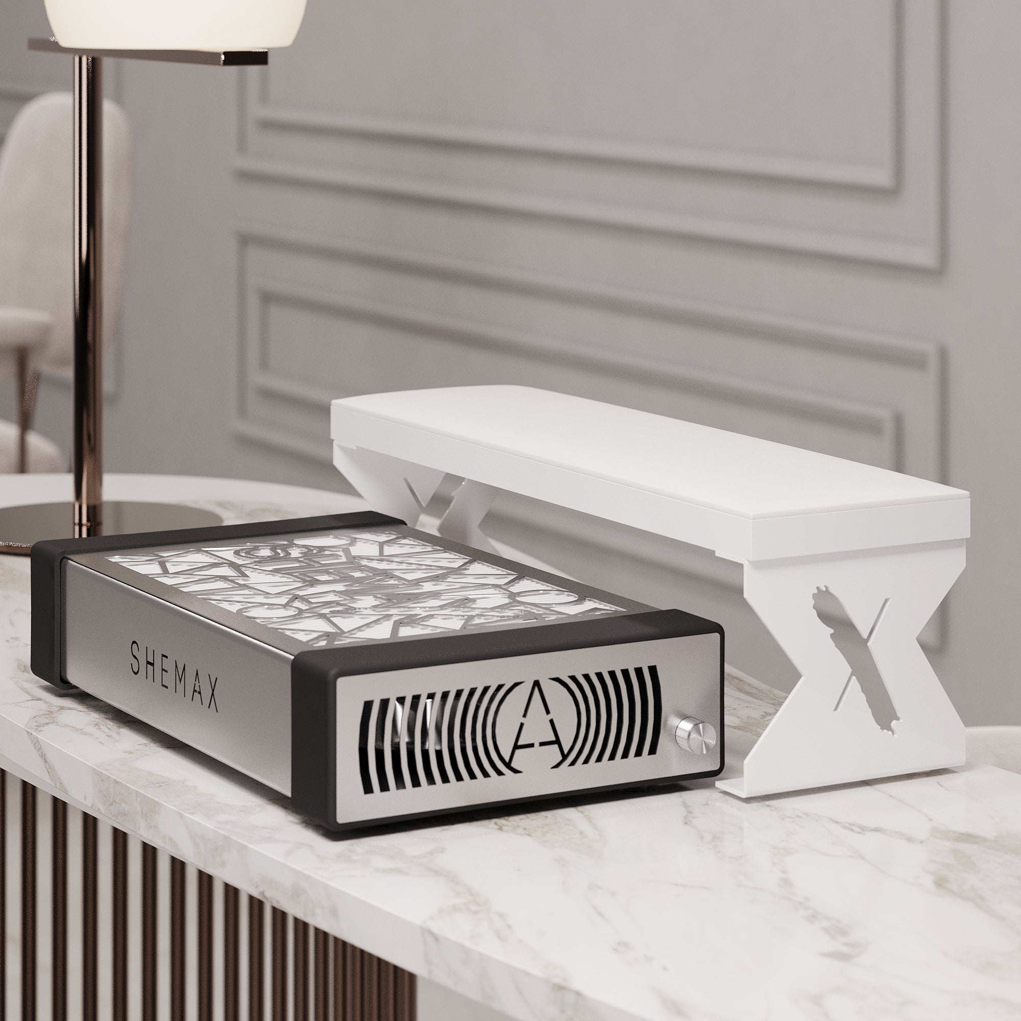 - SHEMAX logotips ir iegravēts uz kājām, piešķirot ierīcei izsmalcinātību un pastiprinot produkta augsto kvalitāti.
